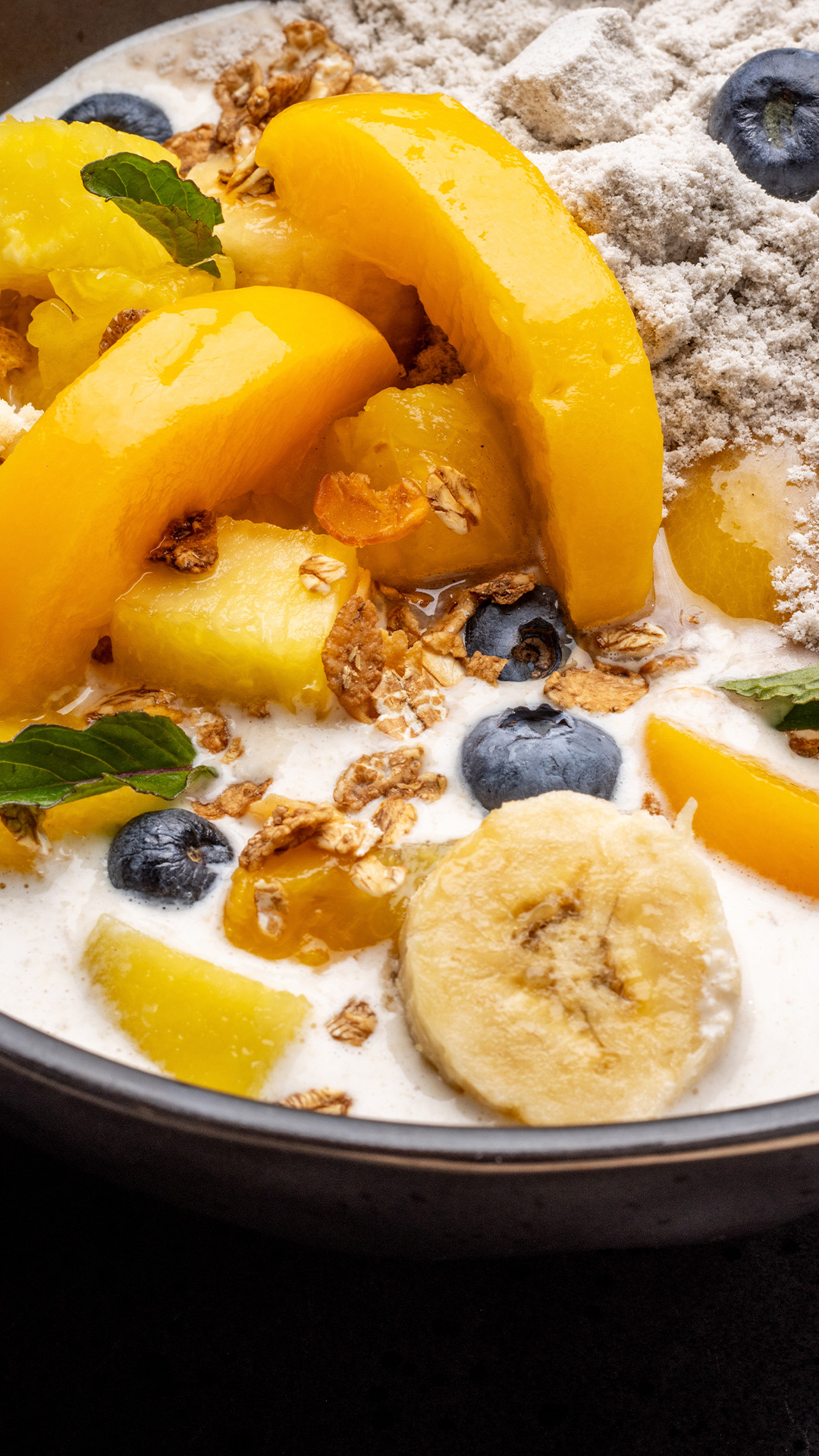 Bowl de piña y duraznos, acompañado de avena, banano, scoop de proteína, yogourt griego y arándanos.