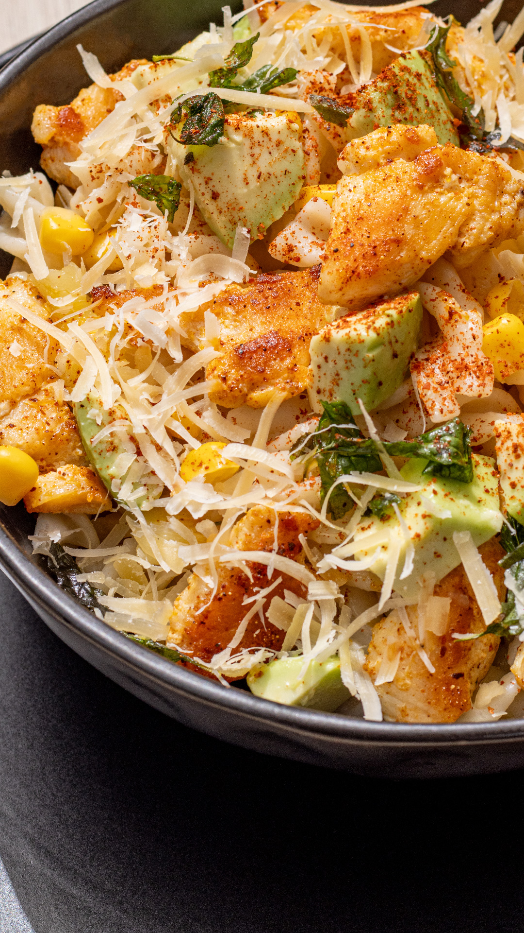 Pasta, trozos de pollo salteado, maíz tierno, aguacate, queso parmesano y albahaca.
