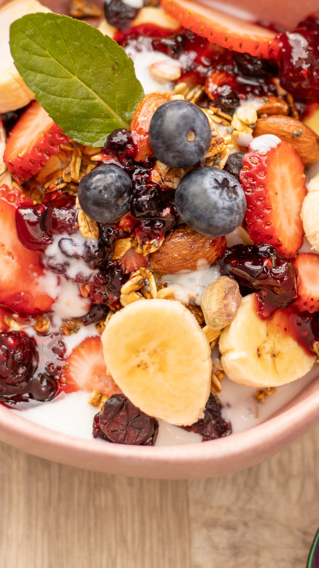 Yogourt griego acompañado mermelada de frutos rojos, banano, fresas, arándanos granola.