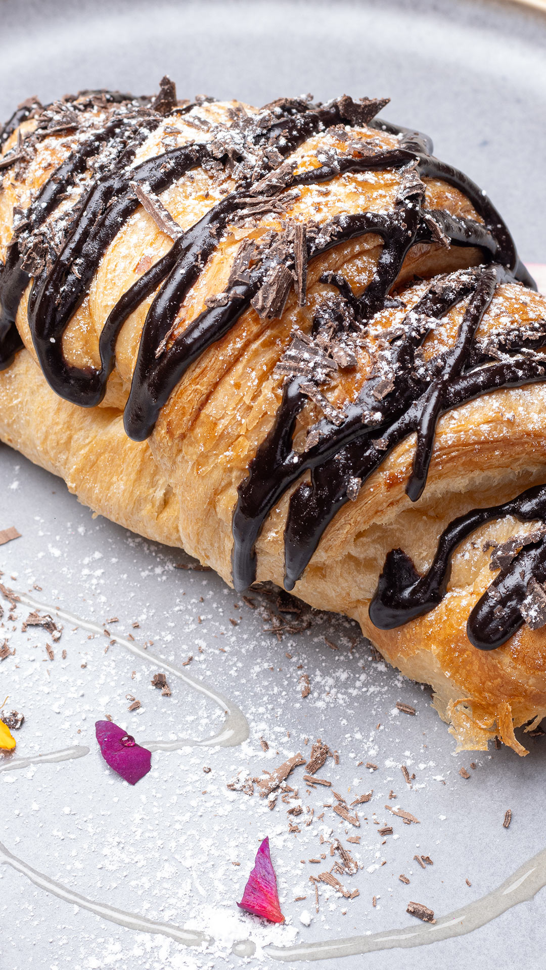 Croisant de mantequilla relleno de de chocolate y azúcar pulverizada.