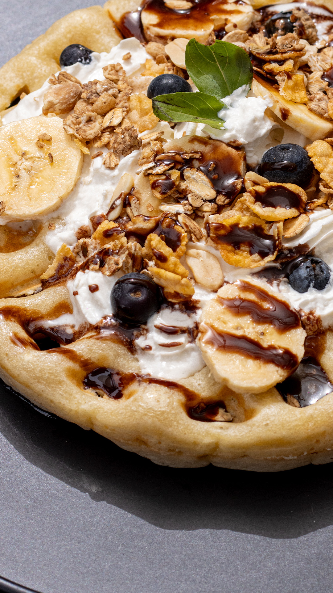 Waffle, acompañado de chocolate Hershey, acompañado de crema chantilly, granola, banano, arándanos y